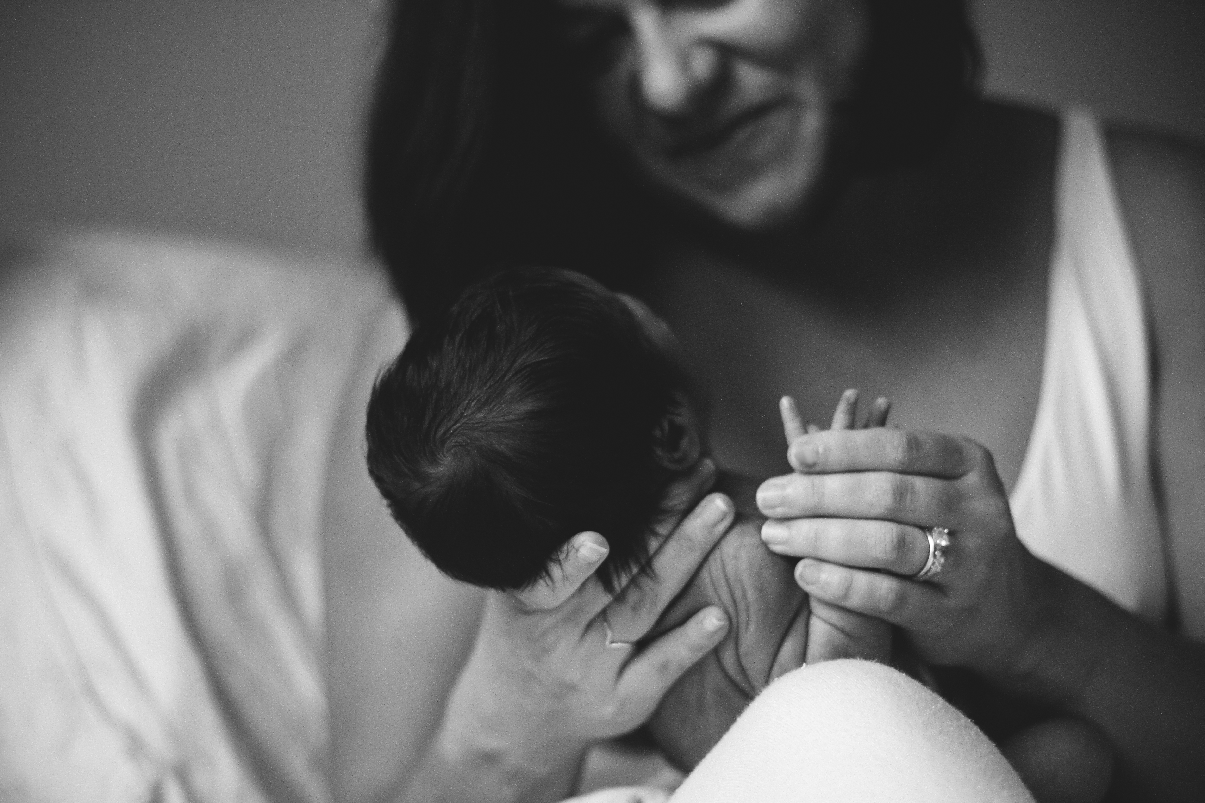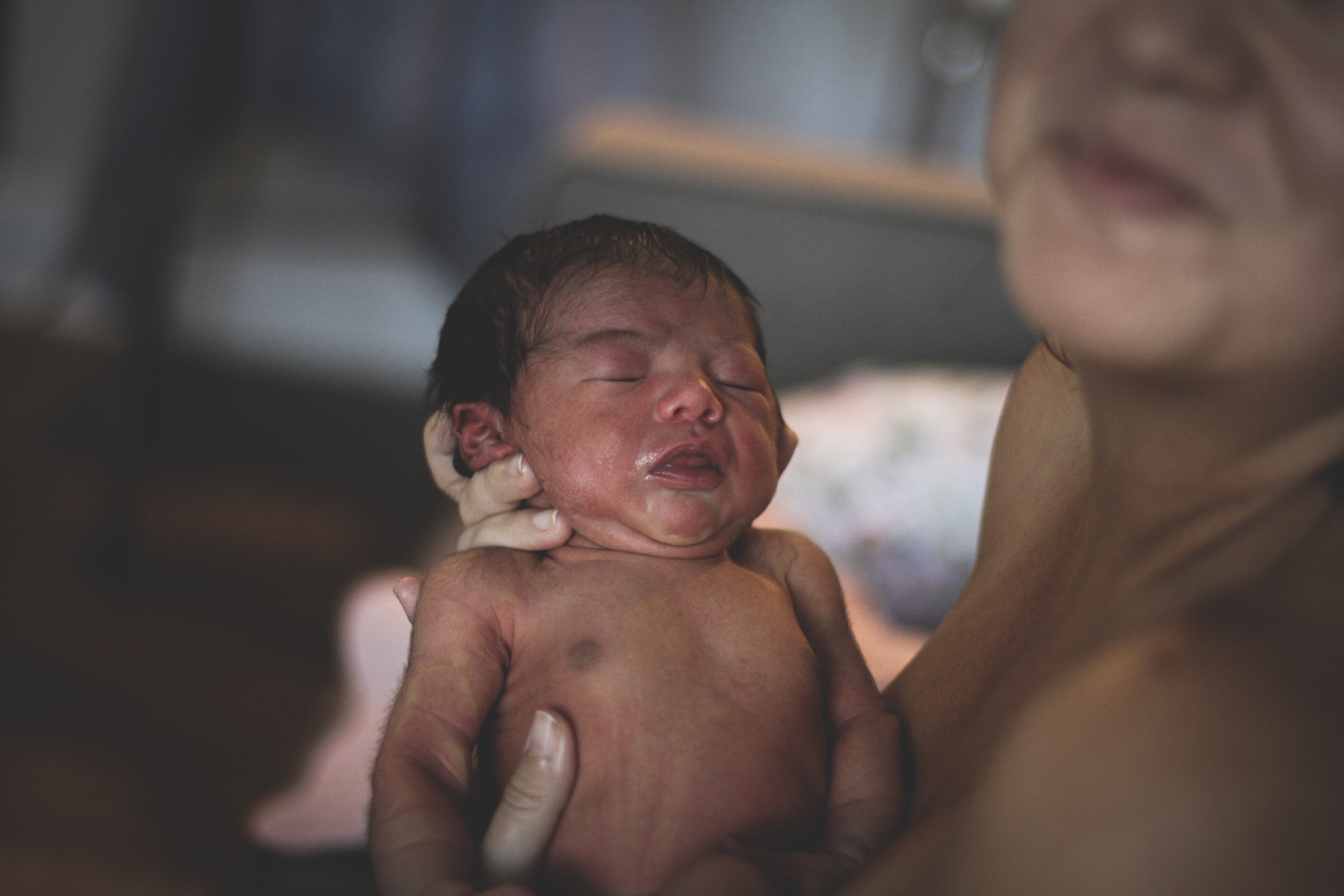 Hoch was able to receive her and then they placed her immediately on my chest. She started crying right away while the other midwife checked her heartbeat and made sure everything was good.